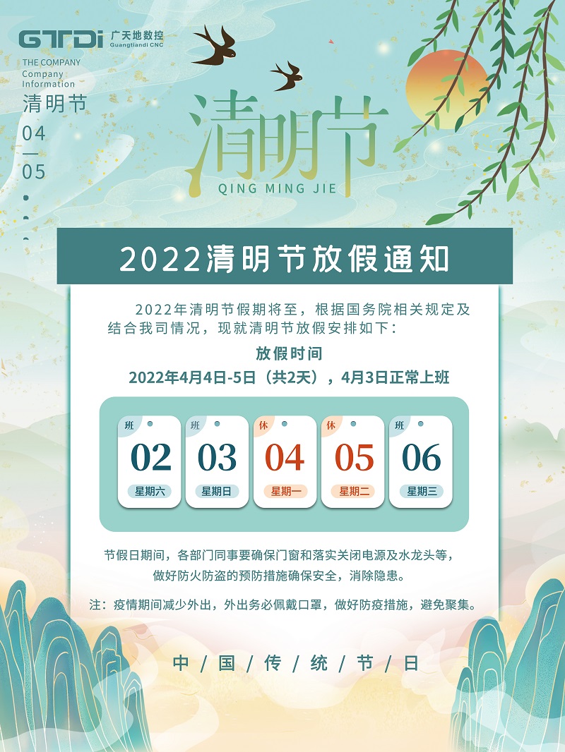根据国务院办公厅《关于2022年部分节假日安排的通知》,并结合我司实际情况,凯发数控2022年清明节放假安排如下: