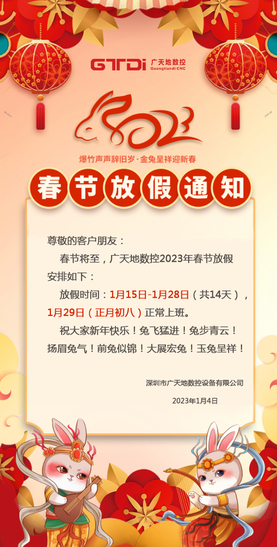2023年春节将至,首先感谢您在2022年里的鼎力支持和愉快合作,凯发数控全体同仁在此给您拜个早年。在新年的一年里,凯发将更加努力,为您提供更优质的服务。按照国家春节放假规定结合我司的具体情况,春节放假时间安排如下: