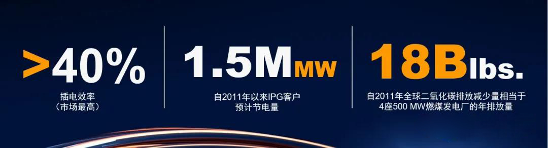 IPG激光器早就实现了40%以上的插电效率(业内普遍水平是20-30%)。这样意味着,同等功率的激光器可实现更小能耗,更低水冷要求,极大降低激光器对电负载、体积和重量的要求。